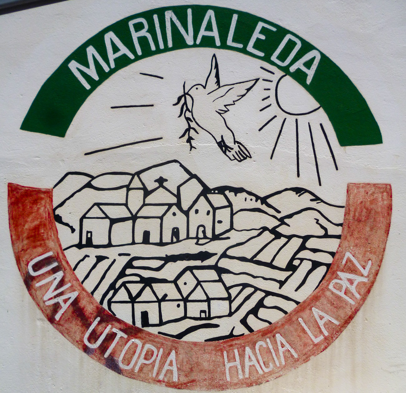 Driving into the town Francisco points out its main landmarks: the Casa del Pueblo (House of the People) Union Hall where unionists come to educate, agitate and organise; the municipal pool where everyone comes to cool off from the soldering heat of the Andalusian interior; the schools, sportsgrounds, and gardens along the way to the council chambers. Marinaleda might appear like any other country town were it not for the countless murals that splash across the walls of these buildings: Che Guevara’s dark eyes gaze out from the sports complex, his famous sign-off Hasta la Victoria Siempre – Until the Victory, Always!’ can be found on a nearby wall. The flags of a red Andalusia, an independent Catalonia and Basque Country, a free Palestine paint the town red, green and blue. Doves fly above words of peace, rebellion and hope; paz, oxi, utopía.