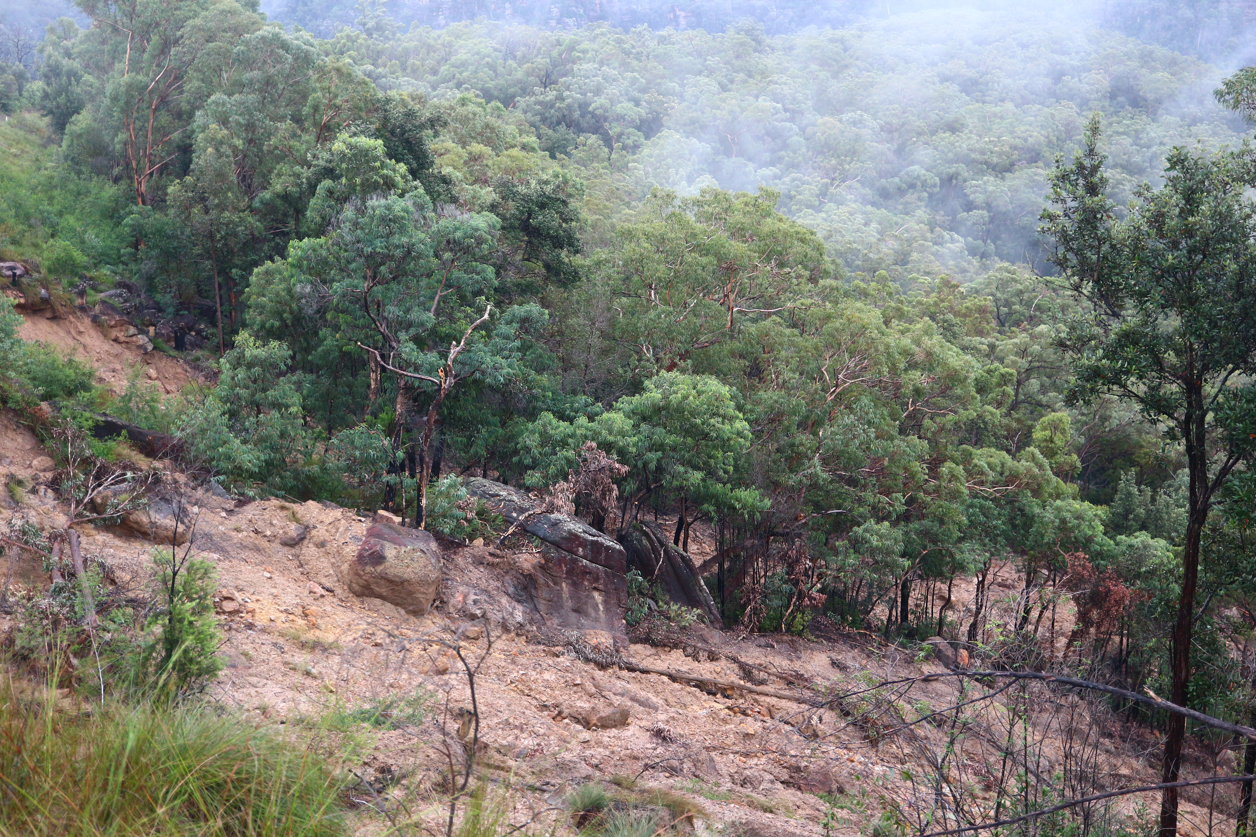 Above: banksias, acacias and wildflowers in the charred landscape. A landslide turns a valley into a quagmire.