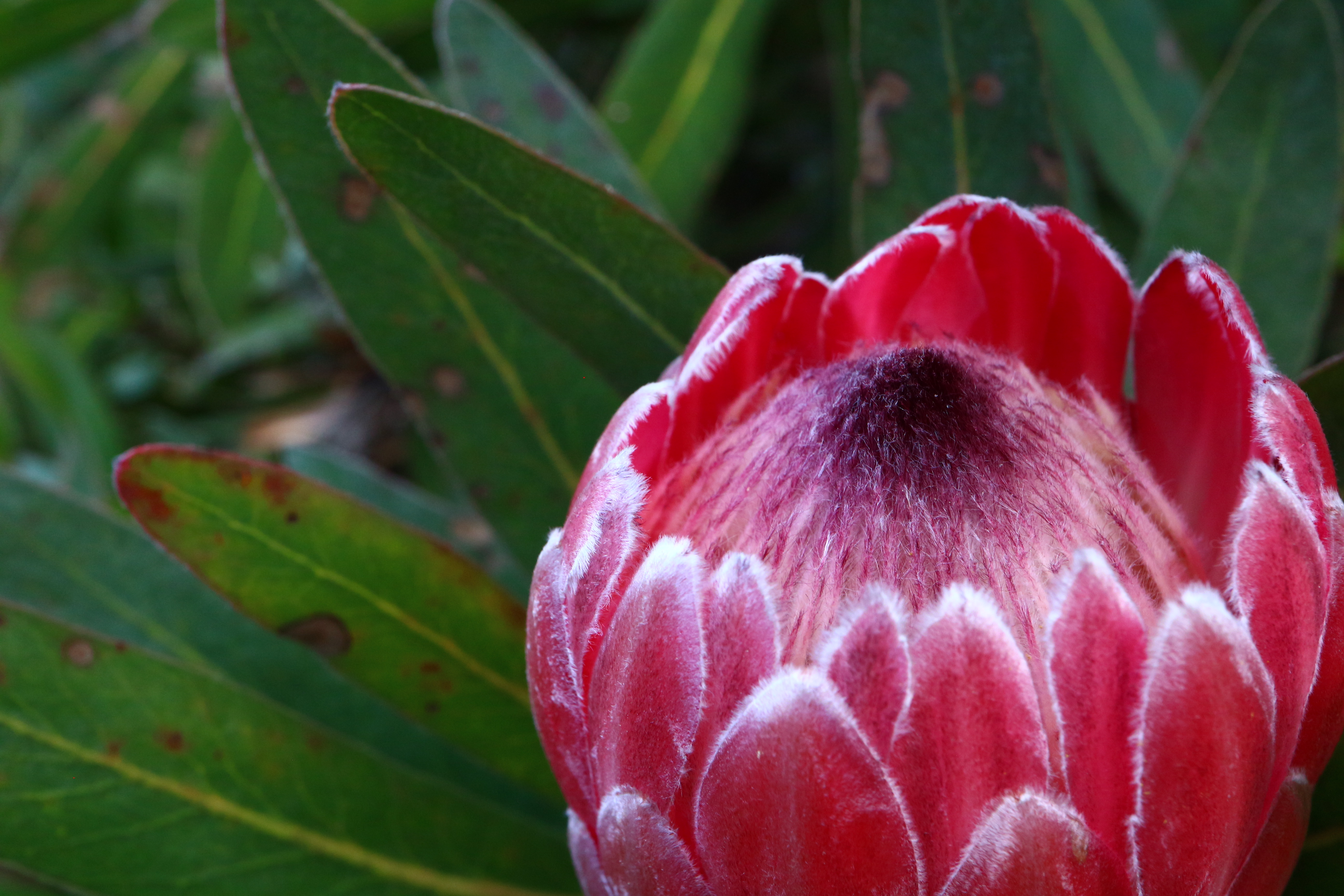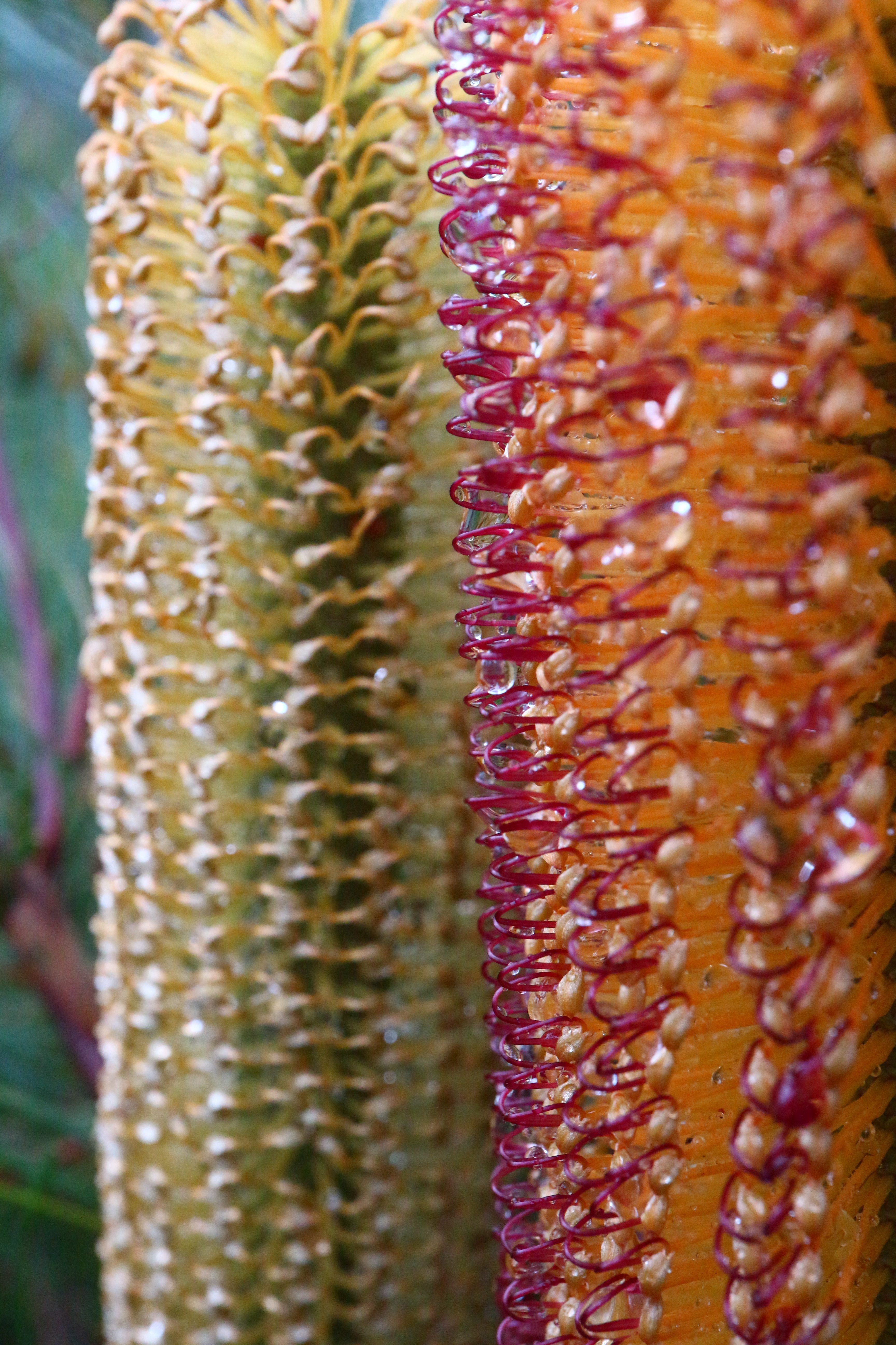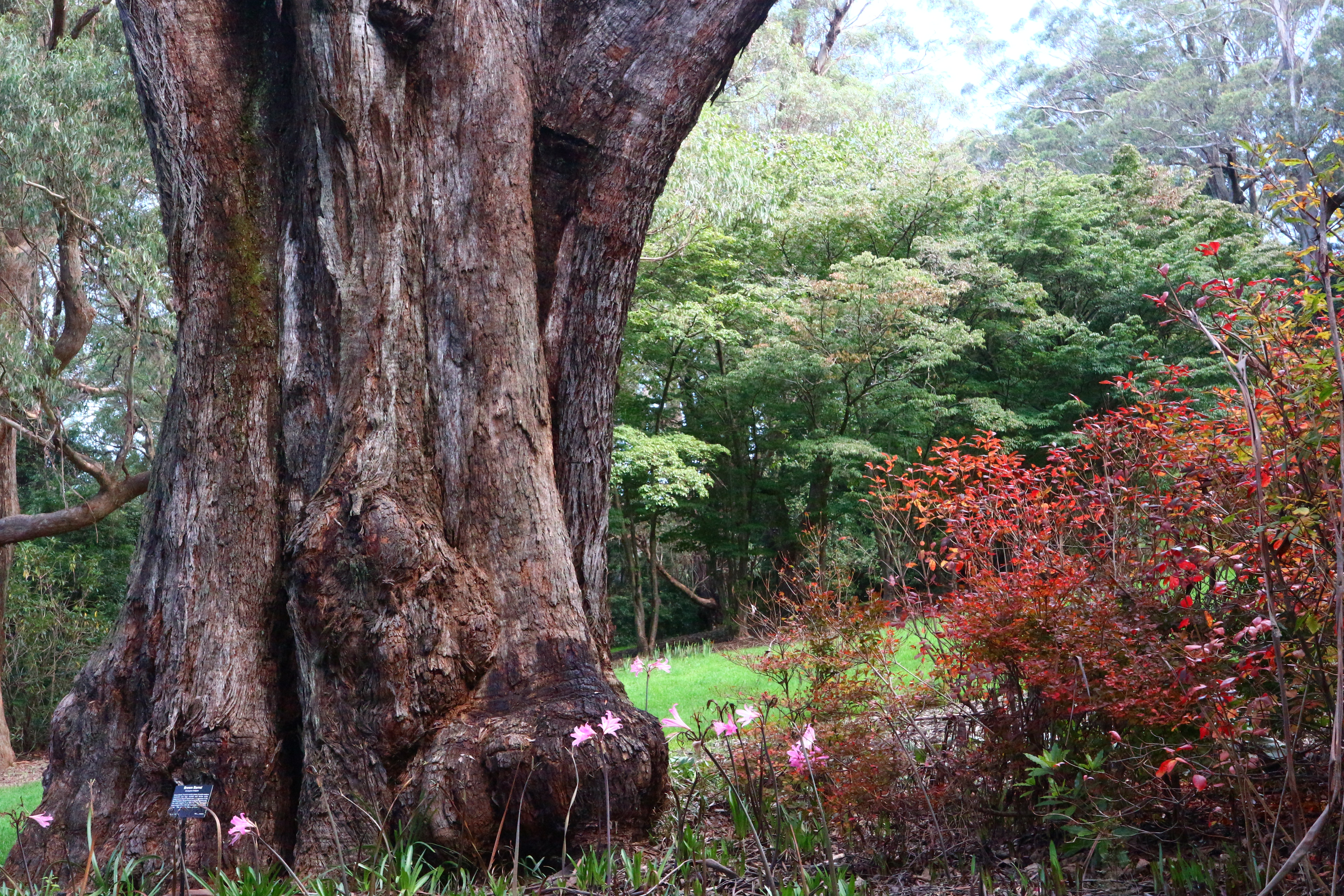 Above: a singed redwood, an ancient Brown Barrel, and a protea in bloom – Mount Tomah Botanic Garden.