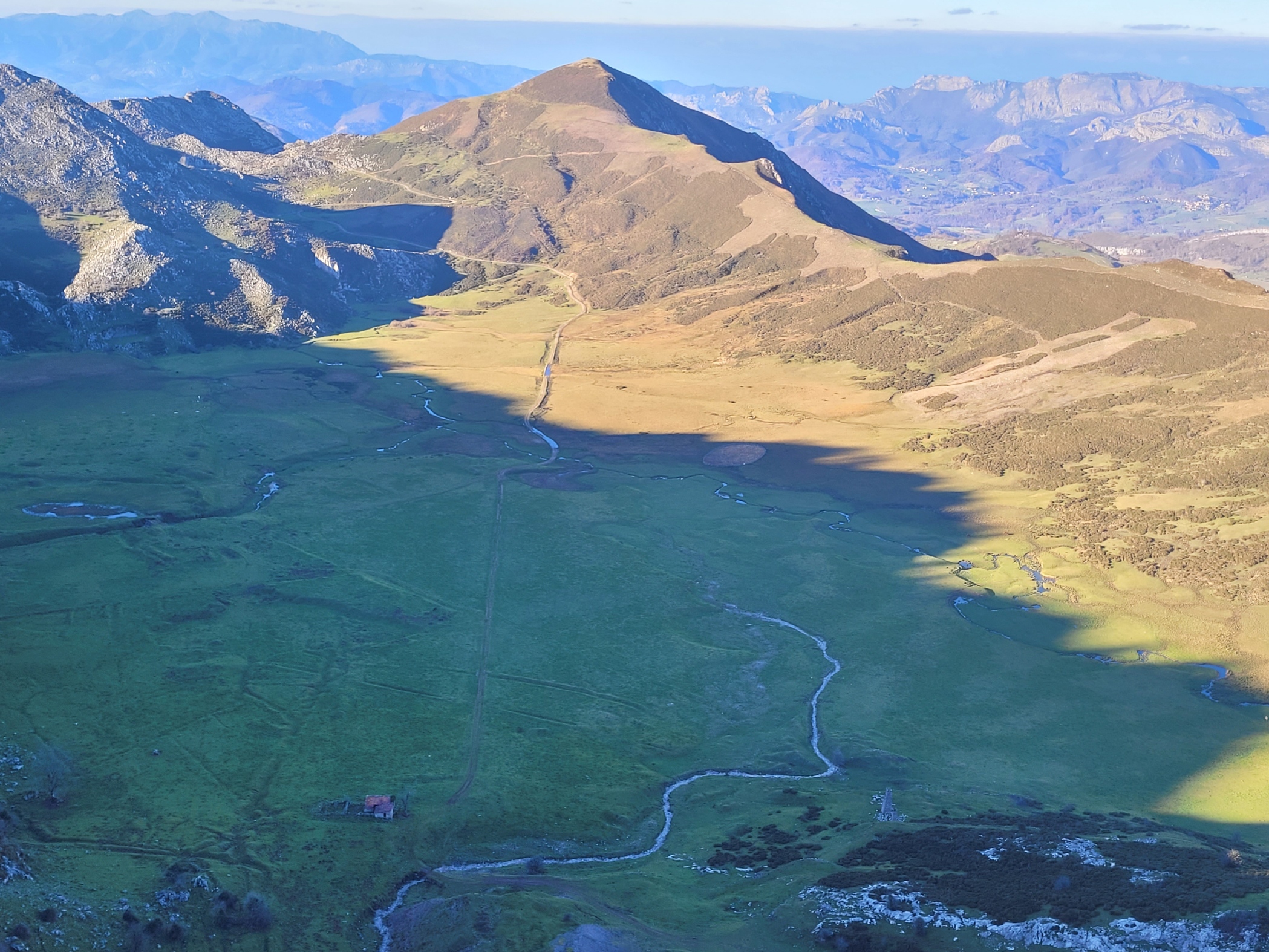 Towering above the pilgrim’s destination at Covadonga sanctuary stands Monte Auseva, an 800-metre peak thick with ancient forests of beech, alder, oak and chestnut growing on its slopes. Climbing the sides, you reach the high meadows growing in the sunken basins formed by dissolving limestone. In one of these meadows, Vega de Orandi, an alpine river (Rio las Mestas) deposits nutrients into the basin, allowing grasses to grow in the humid soils, and turning the fast-flowing stream into a slow meandering creek. Here, shepherds bring their flocks to graze on the thick turf amidst an otherwise infertile land.