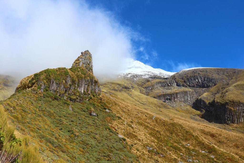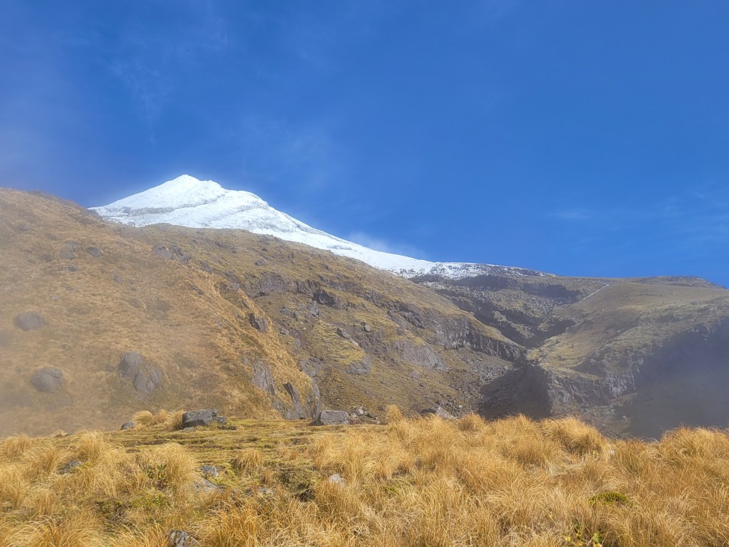 Higher up on the mountainside, the forest gives way to stunted shrubs and mosses amongst tall mountain cedar, and the icy peak becomes visible in brief clearings of the thick cloud that permanently sits on Mount Taranaki. The cloud releases anywhere from 2,500mm to 7,000 mm every year onto the mountainsides, inevitably drenching any ‘tramper’ struggling across the rocky slopes.