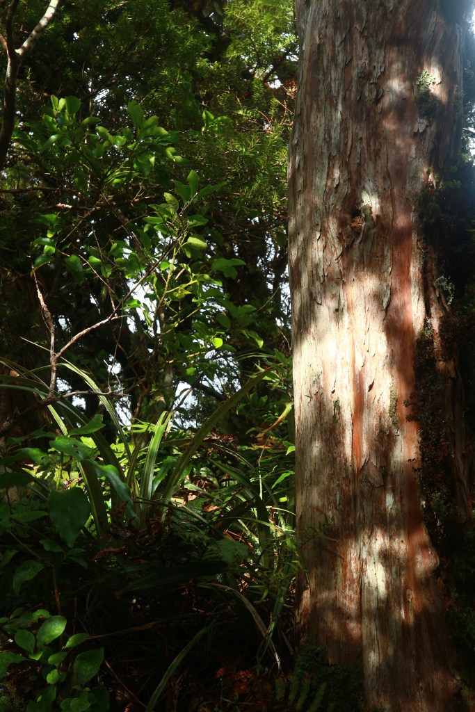 Passing this boundary between the Anthropocene and the pre-human Earth, you are immediately transported back millennia through time, 130 000 years into a dark forest that would have expanded across the entire Taranaki plains. In these lower slopes, a tree called the Kamahi dominates, its gnarled trunks and branches home for layers of mosses, lichens and ferns. Racing through the understory in a storm, the branches of the Kamahi flail in terror, threatening to snap and crush the solitary walker.
